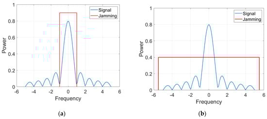 (a) Spectrum of narrowband noise jamming. (b) Spectrum of UWB noise jamming.