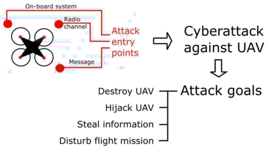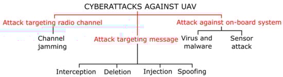 In the previous subsections, basic methods of interference were presented. These methods are generally applicable not only against UAVs. This subsection discusses some of the current options for conducting cyberattacks against UAVs based on previously mentioned methods. A cyberattack is generally an activity that seeks to affect the device in some way against which it is directed. There is an effort to influence the computational and communication functions of the affected device. Figure 8 shows the principle of conducting a cyberattack against a UAV [4].
