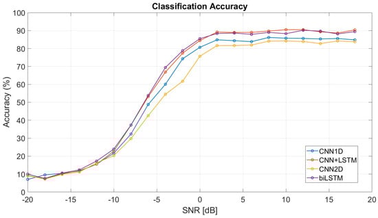 Although the resulting accuracies and losses on the test dataset seem to be poor, it is important to note that the input data are for different SNRs in the range −20 dB to 18 dB. More informative is Figure 19, which shows the model accuracy as a function of SNR. This figure shows that at SNR = 0 dB, the proposed models achieve accuracies exceeding 80%, except for CNN2D. This is a decent classification accuracy considering that the power level of the measured signal is at noise level. The figure further shows that the CNN + LSTM and biLSTM models achieve the highest accuracy from the proposed models. However, even this resulting accuracy is partially misleading. The reason is explained in the following paragraph.