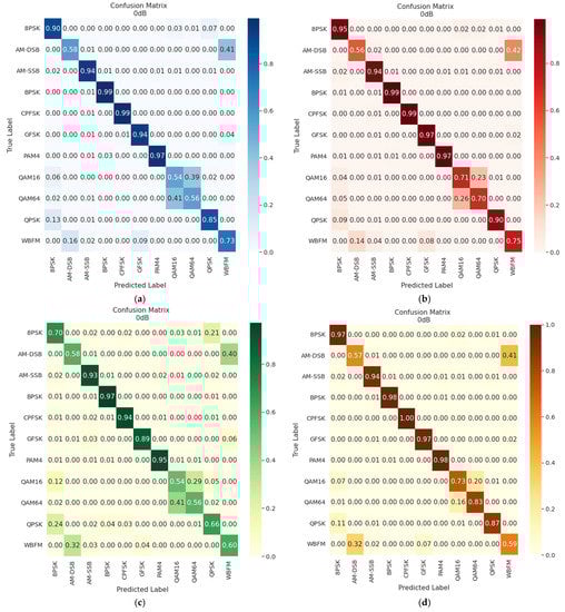 Confusion matrices at SNR 0 dB for (a) CNN 1D; (b) CNN + LSTM; (c) CNN 2D; (d) biLSTM.