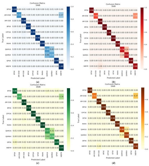 Confusion matrices at SNR 18 dB for (a) CNN 1D; (b) CNN + LSTM; (c) CNN 2D; (d) biLSTM.
