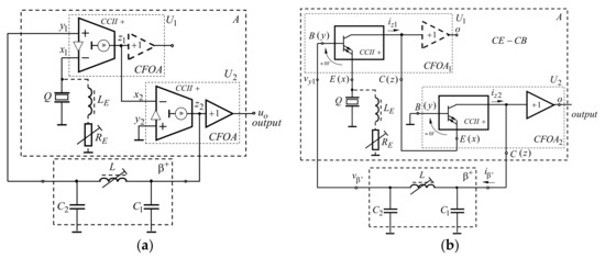 Two-stage oscillator using quartz-crystal resonator which is behaving as an inductor (or equivalent two-stage Pierce oscillator employing four-terminal CFOAs) (QO1): (a) circuit diagram with two CCIIs, represented as parts of four-terminal CFOAs; (b) circuit diagram with two CCIIs, represented as a cascode (common emitter–common base) configuration.