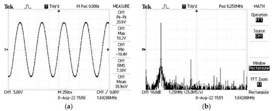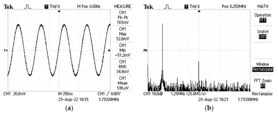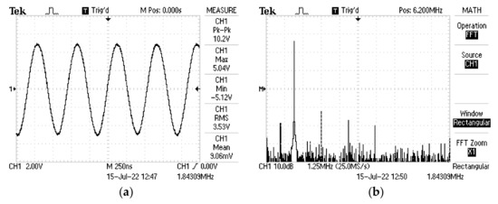 Crystal resonators with frequencies of 1.8432 MHz, 4.0000 MHz, and 10.0000 MHz [36] were used to build the electronic circuit (QO1) in Figure 3, as well as trimmer capacitors [37] Cs with a capacity of 10 to 30 pF, depending on the frequency of oscillations. According to the recommendations defined in Equations (11)–(13), capacitors C1 and C2 with equal capacities were selected, as the equivalent capacity has a value of 16.5 pF, which is less than the maximum load capacity of the selected crystals, which has to be below 30 pF. To adjust the amplitude of the output sinusoidal signals, multiturn trimmer potentiometers [38] RE with values from 10 to 50 kΩ were used. The output signals with maximum value of the amplitude of the QO1 at frequencies fQ1 = 1.8432 MHz, fQ2 = 4.0000 MHz, and fQ3 = 10.0000 MHz are shown in Figure 7a, Figure 8a and Figure 9a, respectively. The output spectrum of the signals at the same frequencies is given in Figure 7b, Figure 8b and Figure 9b, respectively. The signals are measured at an ambient temperature near 25 °C. As can be seen, as the frequency increases, the amplitude of the output signal decreases, and nonlinear distortions also increase (up to 10%). Further reduction of nonlinear distortions can be achieved by reducing the amplitude of the output signal, adjusting RE, and also by reducing the effect of the parasitic capacitances.