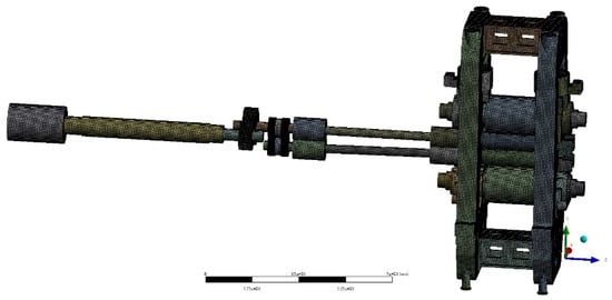 The three-dimensional geometry of the F3 frame is shown in Figure 2. The F3 frame primarily consists of a motor, gear coupling, gearbox gear, gear seat gear, gear spindle, mill stand, back-up roll, work roll, and crossbeam. The role of the motor is to provide power to the primary drive system; the function of the gearbox gear is to adjust the speed of the motor to the speed required by the roll. The role of the gear seat gear is to transmit the torque and speed of the motor to the upper and lower rolls. The motor and roll are connected by a shaft to transmit speed and torque. The work roll is the working part of the finishing mill to complete the rolling process. The backup rolls are in contact with the work roll, and their primary function is to enhance the rigidity and strength of the work roll. The mill stand is used to install all the parts in the work stand, such as the rolls, roll bearings, and roll adjustment devices, and bear the effect of all the rolling forces. In this study, the MCCR line-finishing mill’s F3 mill was selected. The primary parameters of the F3 frame are shown in Table 1.