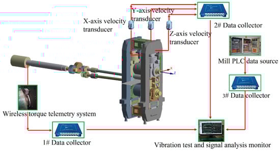 We understood that to determine the vibration state of the MCCR finishing mill, the installation of a vibration online monitoring system is necessary to monitor the vertical, axial, and horizontal vibration signals of the archway and the torsional vibration signal of the F3 motor output shaft. Figure 5 shows the test during the rolling process.