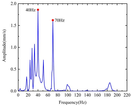 As shown in Figure 10 and Figure 11, the harmonic response simulation results of the vibration’s measuring points in the axial and horizontal directions on the top of the rolling mill arch showed that three sensitive frequencies, namely, 40, 56, and 92 Hz, existed in the axial direction, and two sensitive frequencies, 40 and 70 Hz, existed in the horizontal direction, indicating that the axial and horizontal vibrations of the primary drive system of the F3 mill and the vertical system experienced a vibration-coupling phenomenon.
