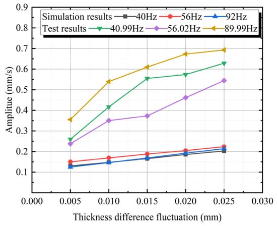 Figure 13 shows the influence of the strip thickness fluctuation on the torsional vibration of the primary drive system. We observed that the simulation results and field test results had the same change trend. The larger the strip thickness fluctuation at the rolling mill entrance, the smaller the sensitive frequency amplitude in the torsional vibration. However, as shown in Figure 14, with the increase in the thickness fluctuation of the strip at the entrance, the vertical vibration in the vertical system becomes increasingly evident, and the vibration amplitude is the largest among the vibrations in the three directions. The results showed that although there were a few slight differences between the experimental method and the finite element analysis, this might have been because of the modal superposition error adopted in the finite element analysis method [14,15].