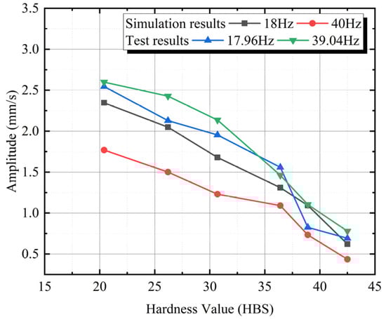 In Figure 19, Figure 20 and Figure 21, it can be observed that with the increase in the strip hardness, the vertical, axial, and horizontal vibration amplitudes in the vertical system gradually decrease and the vertical and horizontal vibration decrease significantly. The fluctuation of the strip hardness had no evident effect on the axial vibration of the vertical system.