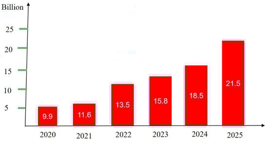 In the past few years, the number of Internet of Things (IoT) devices (IoTDs), such as wearable devices, has risen explosively [1]. According to the IOT ANALYTCS, the number of active IoTDs will grow to 22 billion by 2025 [2], as Figure 1 illustrates. The growing number of IoTDs has resulted in various IoT applications, which are typically delay sensitive and require a lot of computation resources. However, most of these IoT devices usually have limited resources and constrained battery power [3,4], which imposes a bottleneck for processing IoT applications. Although the remote public cloud (e.g., Amazon EC2) can provide abundant computing resources for processing IoT applications, their data centers are far away from the IoTDs, which will cause a long transmission latency. Therefore, the distant public cloud may not be suitable for latency-sensitive IoT applications [5].