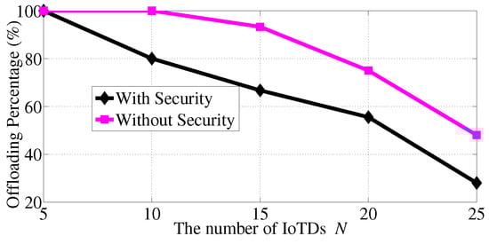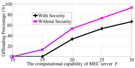In the last section, we analyze the impact of the computational capacity of the MEC server on the offloading percentage of IoTD users under the unsecured model and the secured model. We set the number of IoTD users N as 15 and vary the computational capability of the MEC server from 10 GHz to 30 GHz. We present the corresponding results in Figure 7. It can obviously be found from Figure 7 that the offloading percentage of IoTD users will increase with the computational capabilities of MEC servers increasing. Moreover, the offloading percentage under the secured model is lower than that under the unsecured model. This is because taking the secure technique will cost additional processing time and energy.