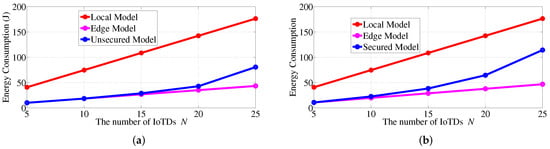 Figure 4 shows the energy consumption of all tasks versus different numbers of IoTDs. Specifically, Figure 4a makes a comparison of the energy consumption under the models of Local Model, Edge Model, and the Unsecured Model, and Figure 4b also shows the consumed energy in the Secured model. It is evident from the two figures that processing tasks of IoTDs under the Local Model consumes the most energy of the four models. In contrast, less energy is consumed in the Edge Model than the other three models. It can also be observed that energy consumption significantly increases when the number of IoTDs rises. Furthermore, we can notice that, when the number of IoTD users is less than 15, the energy consumption under the Secured model and the proposed Unsecured model are both near to the Edge model. However, when the number of IoTD users exceeds 15, the gap will become larger.