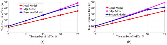 Figure 5 depicts the task-execution time of all the IoTDs versus different numbers of IoTDs under different models. In Figure 5a, a comparison among the models of Local Model, Edge Model, and the Unsecured Model is shown, while Figure 5b shows the task-execution time of the Secured model. By observing Figure 5, it is found that the task-execution time in the Local Model is the least among the four models, while processing in the Edge Model costs more time than the other three models. From the two sub-figures, we see that the total task execution time under the four models, respectively, increases if the number of IoTD users increases. By comparing Figure 4 and Figure 5, we find that the proposed Secured Model consumes more energy than the baseline model Unsecured Model, while costing less time. In addition, it can be noticed that, when the number of IoTD users is less than 20, the task-execution time under the Secured model and the proposed Unsecured model are both near to the Edge model. However, when the number of IoTD users exceeds 20, the gap between the two models will become larger.
