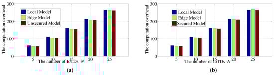 Figure 6a,b show the total computation overheads under the Unsecured model and Secured model, respectively. It can be noticed from Figure 6a that the computation overheads under the Unsecured model are higher than under the Local Model and the Edge Model. It can be noticed from Figure 6b that the computation overheads under the proposed secured model are higher than under the Local Model and the Edge Model. By comparing Figure 6a and Figure 6b, we observe that the proposed secured model obtains higher computation overheads than the Unsecured model. However, the gap is not obvious. This may be the reason that encrypting and decrypting data of the tasks of IoTD users may cause extra computation overheads. In addition, it is noted that the computation overheads in the Local Model are higher than or near equal to those of the Edge Model when the number of IoTD users is less than 20. However, the computation overheads under the Edge Model will be higher than the Local Model when the number of IoTD users is over 20.