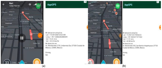 Figure 11a,b, it can be concluded that as data are entered through the sensor network, MAP feeds on the dynamic events that occurred in the days, hours, and months that were monitored. The result obtained reflects the behavior of what happened that day in relation to traffic, similar to what is observed with the results obtained with the Moovit and Google Maps platforms.