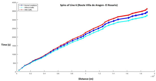 Table 5, we obtain that the time deviation with respect to what is programmed for the Moovit application is ±12.188 min of travel; for Google Maps, a deviation of ±12.149 min is obtained; and, finally, for MAP, based on 390 trips obtained from the autocorrelation matrix, a time deviation of ±10.85 min was obtained with respect to the programmed result. From