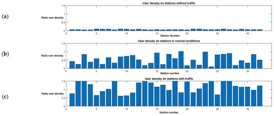 Figure 12b shows the user density behavior under normal traffic conditions. In this scenario, an increase in users is observed, and the highest points of the graph show stations close to reaching 100% of their capacity. Finally,