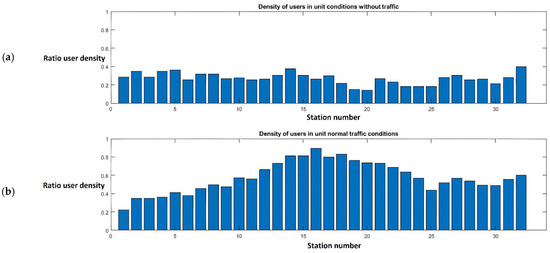 Figure 13a shows the density of users in a unit under without traffic conditions, which is at 30% of its capacity on average. Under normal traffic conditions, it reaches 65% of the average capacity (
