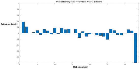 Figure 14 demonstrates, the data reflect the behavior analyzed on the routes. The results allow the periods of the day and the traffic conditions where there is a greater density of users, that is, a greater demand for service, to be identified. Within the hours of 06:00–10:00, 12:00–16:00, and 18:00–22:00, the highest user density on the route was identified, which was greater than 80% of the service capacity. Finally, the density model was evaluated, through which it is possible to identify the stations on the route where users board and exit more frequently. In