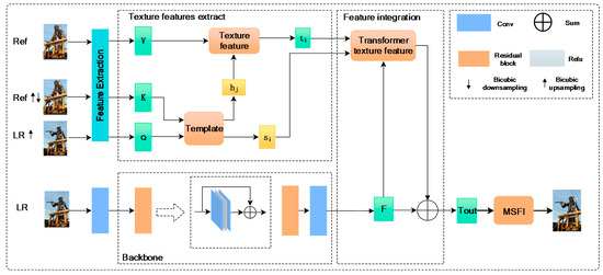 In this study, low-resolution images and reference images needed to be prepared in the network. The first image was a low-resolution image to be restored. We then needed to prepare reference images related to the low-resolution images. Inspired by [23], the bicubic interpolation method achieved a better performance, so the bicubic interpolation method was selected as the main interpolation method for upsampling/downsampling in this network. The texture features need three images in the networks as the input feature vectors K, V and Q, so we needed to find the input image and the reference image. After four rounds of bicubic interpolation, the obtained reference image was expressed as Ref ↓↑ and the LR image was expressed as LR↑. Meanwhile, the reference image needed to be represented as Ref in order to input it into the texture transformer network. The corresponding features of the LR images were outputted by the backbone, and the output feature maps were then used to generate super-resolution images with the three feature vectors through feature extraction and fusion. The texture converter’s structure is illustrated in Figure 1.