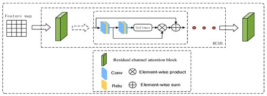 The shortcut inside the residual allowed a large number of low-frequency channels to pass through. Consequently, the method selected for this experiment was the MRCAB composed of four to eight RCABs, which could achieve a better channel transmission effect. The network structure of this experiment is shown in Figure 4.