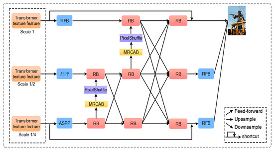 To solve these problems, the receptive field block can balance a small amount of computation and enlarge the receptive field [39], atrous spatial pyramid pools can capture a larger proportion of the contextual information of images, and the residual channel attention block can enhance the learning ability of the channel. In this study, a multi-scale fusion texture transformer network was proposed to further improve the performance.