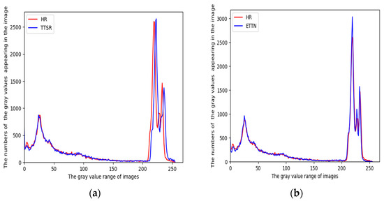 The study principally compared the degree coincidence of the images from the CUFED datasets for testing. As shown in the results, the TTSR model still had a higher degree of conformity and still performs better than the ENNT model when the pixels (Figure 6a) were in the range of 50 or so. Though the gray value was around 50–230 with the ENNT, providing a good result (Figure 6b), the ENNT model had a stronger effect on the pixels’ range.