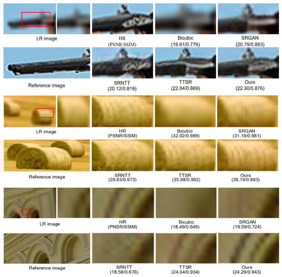 As shown in the first example in Figure 7, the test used CUFED5 datasets, and the output LR images and the reference image show that the effect of local information recovery was excellent. The second sample was from the Sun80 datasets, and used the same methods as the first example. The method obtained the local details, the effect of texture recovery was better, showing that the effect was excellent. The final example obviously showed the effects of image restoration, where the textural details were extracted very well, specifically highlighting the texture of strips. Therefore, this showed that the algorithm had a remarkable effect on more organized information. Finally, even if the high-resolution reference images and low-resolution input images are not globally correlated, our proposed model can extract extremely extensive parts through local extraction. At the same time, the information can be essentially converted into super-resolution results. Moreover, the proposed method is more suitable for real images than other reference super-resolution methods. Qualitative comparisons showed that the method could successfully integrate textural features with LR features. This is valuable for obtaining satisfactory super-resolution results as a reference.