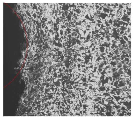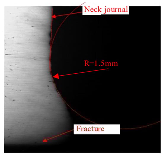 The load drum shaft broke at the neck journal root with diameter Φ220 mm, and a magnified image of the transition fillet is shown in Figure 2. According to the standards in Parts Rounding and Chamfering, when the shaft shoulder diameter difference is more than 40 mm, the fillet radius should be 4 mm. However, the actual fillet radius of this shaft shoulder was approximately 1.5 mm, which may have led to a high stress concentration.