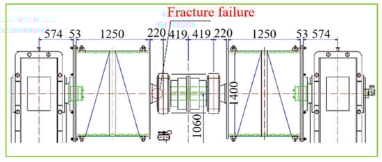 The bilateral propelled hoisting mechanism contains two load drums with shafts at their ends. One load drum shaft is connected to the output shaft of the reducer through a coupling, and the other load drum shaft is connected to the other load drum through a coupling too. The load drum, as a component in the hoisting mechanism that experiences very complex forces, carries the dynamic load produced not only by the lifting and dropping of the workpiece but also by the operation, control and behavior of the motor, transmission system, braking system and other components. Thus, failure of load drums is responsible for approximately 25% [], the largest proportion, of crane accidents. The load drum shaft is the part of the load drum that is most likely to fail. More importantly, once the load drum shaft breaks, it causes downtime and even serious accidents due to falling objects. For example, at Hebei Tangshan Steel Co., Ltd., a serious accident occurred in which the load drum shaft broke when the casting crane was lifting a ladle of molten iron. The coupling that connected the load drum and the reducer tore, and the load drum fell off the frame; accordingly, the ladle was inclined and molten iron overflowed, and consequently, the production line burned []. Although the failure of load drum shafts has always been a concern of the crane industry, current research into load drum shaft failure is still mainly based on qualitative analysis [,,,,].