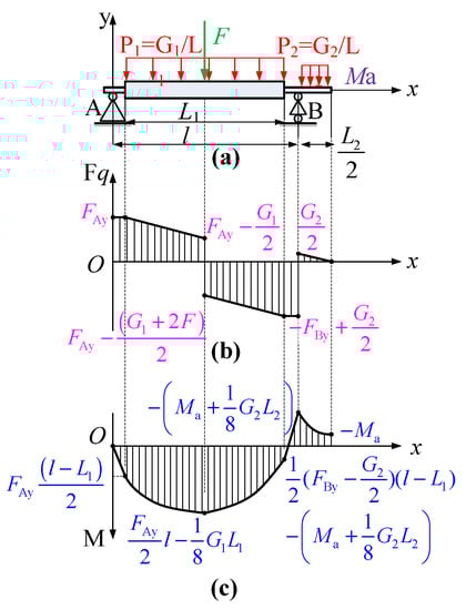 Considering the above assumptions and the symmetrical structure of the couplings, the force and flexural moment of the equivalent hinge of the coupling were both 0, and the static model in Figure 5 was simplified to the beam structure shown in Figure 6a. The gear engagement of coupling generated a bending moment Ma in the axial direction due to friction. According to JB/T 8854.2-2001, Ma = 0.1Tmax, where Tmax is the maximum torque acting on the coupling. Obtained by calculations using the mechanics theory of materials science, the shearing force diagram and bending moment diagram are shown in Figure 6b,c, and the maximum absolute value of the shearing force and bending moment for the load drum and load drum shaft were calculated using Equations (1)–(3).