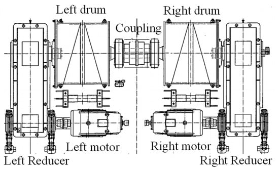 As shown in Figure 7, when the hoisting mechanism operating, the motor drives the transmission components, such as the reducer, the load drum, and the wire rope, to lift heavy objects. The hoisting mechanism bears dynamic loads that include the dynamic electromagnetic torque generated by the motor under the speed control system, and the loads, which are the forces generated by the structure with friction, assembly tolerance, interstice and damping behavior, and the forces generated by weight while lifting, lowering and braking. Particularly for the bilateral propelled lifting mechanism, high dynamic loads are carried for the asymmetric structure, and the nonsynchronous control system changes the force distribution in its driving system.