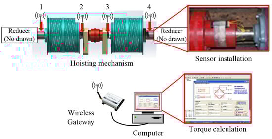 To study the dynamic behavior of the hoisting mechanism, a test system was constructed on a cast bridge crane with a broken drum shaft, as shown in Figure 8. The test system included a strain-torque telemetry equipment, strain acquisition sensor, data acquisition equipment and other modules. Table 4 summarizes the performance parameters of the cast bridge crane, and Table 5 summarizes the types of main instruments for the test.
