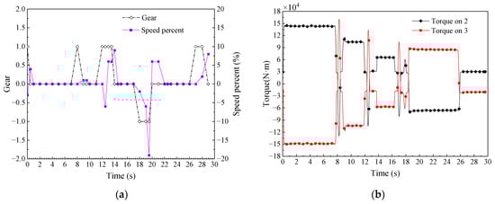 Since working condition 6 is most frequently used, and the dynamic behavior of the crane in this condition is most representative for it involves operations such as lifting, dropping, braking and direction adjustment, working condition 6 was taken as an example for analysis. The motor speed, gear position and torque of the load drum shaft for 30 s are shown in Figure 9.