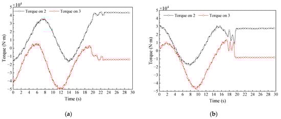 Figure 10a,b show the torques measured at points 2 and 3 when the crane worked in the 1st gear, and the object weight was 40.44 t. All braking started at 20 s. Prior to braking, when the object was being lifted or dropped, the torques on the load drum shafts vibrated with a high amplitude and low frequency, and there was a phase difference between them. After braking, the torques on the load drum shafts remained stable after short-term vibrations at high frequency.