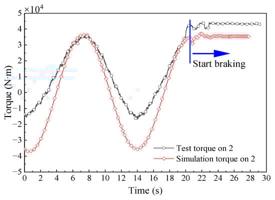 Taking the test condition shown in Figure 10a as an example, when the hoisting weight (40.44 t) of the hoisting mechanism was in the process of hoisting and braking in the 1st gear, the torque at measuring point 2 on the load drum shaft was tested and simulated. The simulation and test torques are shown in Figure 13.