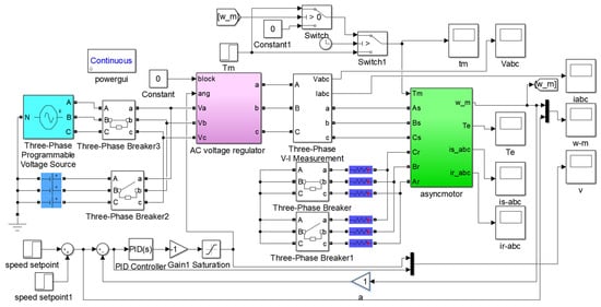 According to the mathematical model, the simulation model of the three-phase asynchronous motor and its speed control system was built in the MATLAB/Simulink, as shown in Figure 14. The motor model mainly included the stator module, rotor module, flux linkage module and torque module. The motor speed control module mainly included the thyristor stator speed regulation module with voltage regulation, the rotor speed regulation module with connecting resistance, and the braking control module with energy consumption.