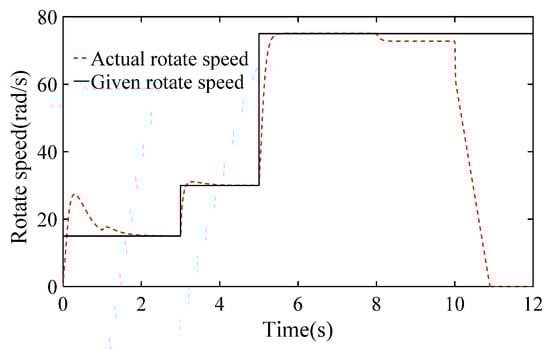 The given motor speed and load torque during the simulation are shown as solid lines in Figure 15 and Figure 16, and the total simulation time was 12 s. When starting, the given motor speed was 15 rad/s, and the load was 300 N m. At 3 s and 5 s, the given speed was increased to 30 rad/s and 75 rad/s, respectively. At 8 s, the speed remained unchanged, and the load was increased to 500 N m. At 10 s, the brake was turned on until the rotor speed dropped to zero, that is, the motor load became zero. The dotted line in Figure 15 shows the rotational speed obtained by the simulation.