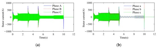 Current curves of motor: (a) three-phase current of stator; (b) three-phase current of rotor.