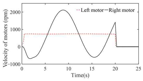 As shown in Figure 19, under the motor speed control system, the speed of the left motor changed smoothly. However, the right motor 6 was towed, and its rotational speed oscillated with a period of 13 s. Additionally, the average speed of right motor was equal to that of the left motor.