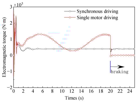 As shown in Figure 20, the electromagnetic torque of the left motor exhibited overshoot behavior that was basically consistent with the oscillation of the electromagnetic torque during synchronous driving. Additionally, the electromagnetic torque of the left motor was twice the average when the hoisting mechanism was in synchronous drive. In addition, comparison of Figure 19 and Figure 20 shows that the electromagnetic torque of left motor oscillated periodically, with a 90-degree out-of-phase difference from the rotational speed.