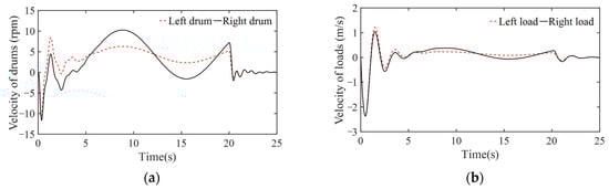 As shown in Figure 21 and Figure 22, single-motor towing also affected the dynamic behavior of the two load drums. Figure 21a shows that the rotational speed amplitude of the left load drum, 5 r/min, was less than that of the right load drum, 15 r/min, but their oscillation tendencies were basically the same. The speeds of the two load drums decreased rapidly after braking and stopped after short-term oscillation. It can be concluded from Figure 21b that the rotational speeds of the two load drums oscillated with a period of 13 s after 5 s, and the average values were both 4 r/min, which ensured that the lifting speeds of the left and right sides were basically the same.