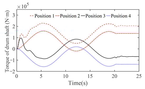 The dynamic behavior of the crane under other working conditions was similar to that under working condition 6. Once the gear position changed, lifting, falling or braking would consequently occur, and vibrations and impacts would occur in the hoisting mechanism. When objects rose or fell, there was a certain phase difference between the torques on the two load drum shafts, as shown in Figure 10.