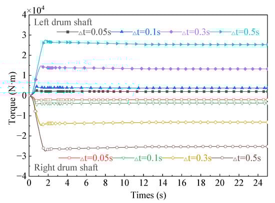 When the hoisting mechanism lifted a heavy object in 1st gear and the startup time difference Δt of the two motors was 0.05 s, 0.1 s, 0.3 s, and 0.5 s, the torque of the left and right drum shafts changed, as shown in Figure 23. According to Figure 23, the asynchronous start of the motor generated a large torque on the load drum shaft, and the torque was positively correlated with the time difference, Δt. When Δt decreased from 0.5 s to 0.05 s, the absolute value of the torque decreased from 2.7 × 104 N∙m to 2.5 × 103 N∙m. The torque decreased slowly with running time increased.