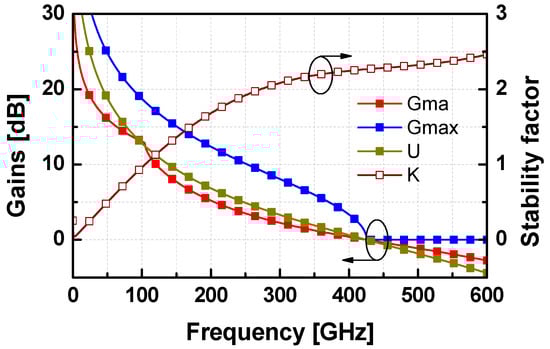 We performed an s-parameter simulation on a post-layout extracted HBT with an emitter size of 2 × 70 nm × 900 nm. The reference metal was the second-most bottom layer (M2). Figure 2 shows the simulated gains, including maximum available gain (Gma), unilateral gain (U), maximum achievable gain (Gmax), and the stability factor of the RC-extracted transistor. The simulated fmax of the transistor was reduced to about 420 GHz even with external layer extraction up to M2. At 280 GHz, the upper bounce of the power gain of the chosen HBT was about 8.9 dB. Employing a proper embedding network could increase the gain of an amplifying stage close to Gmax at the cost of a significant reduction in the operation bandwidth [23]. However, the transistor can be easily unstable under this condition due to process variations.