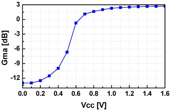 Simulated Gma at 280 GHz of the transistor (2 × 70 nm × 900 nm) versus supply voltage when the base bias current is fixed to 21 μA.