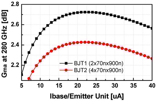 Simulated maximum available gain (Gma) at 280 GHz of HBTs versus the base bias current which is scaled with the emitter size of 2 × 70 nm × 900 nm as a unit).