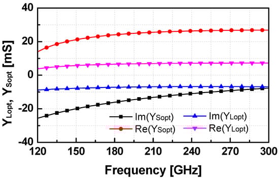 Figure 5 presents the optimum load and source admittances of the post-layout RC-extracted HBT with the emitter area of 2 × 70 nm × 900 nm. The optimum load and source admittances are given by