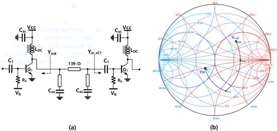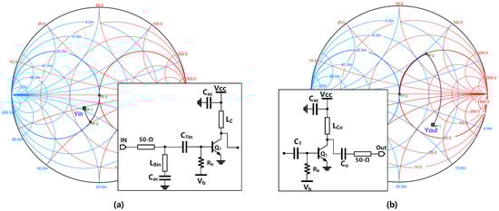 For the input and output port, the impedance matching was carried out similarly to the interstage impedance matching, except that the aimed matching resistance was 50 Ω. The impedance transformation for the input impedance matching is demonstrated in Figure 9a. In the same procedure, the impedance matching network for the output was implemented with a shunt short stub with a T-line (LCo) to the collector and a series capacitor (Co), as shown in Figure 9b. For a short-stub implementation, relatively large bypass MIM capacitors were used.