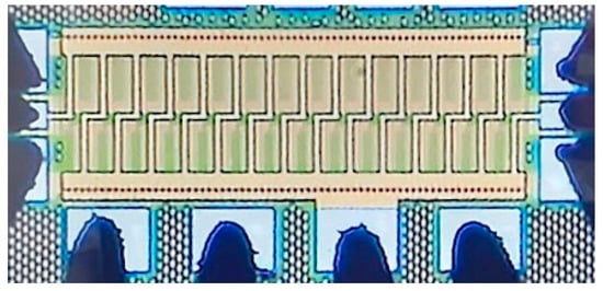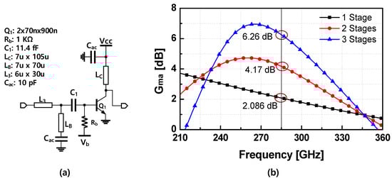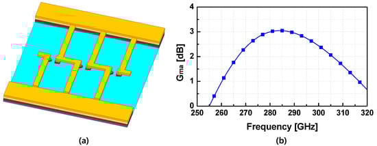 An impedance matching network with capacitors and T-lines provided by the PDK was used to verify the designed matching circuit as shown in Figure 8a. Since the T-line model considers the insertion loss, the circuit element values calculated previously were slightly different from the values from the ideal components. It is noteworthy that the T-line model from the PDK was found to be slightly optimistic compared to the EM simulation results. As can be seen, the Gma of the multiple stage amplifiers with two and three stages achieves twice and three times the Gma of the single stage at the target frequency of 285 GHz, which verifies the proposed interstage works well. Note that the plots of Gma versus frequency shows the peak Gma of around 267 GHz for the multi-stage amplifiers, and the peaking frequency of the 10-stage amplifier was simulated to be ~268 GHz. The peak at the lower center frequency is due to the −6 dB/oct roll-off characteristic of the Gma near the fmax. To compensate for the roll-off effect on the gain profile, the interstage impedance matching circuit should be implemented, aiming at a higher frequency to achieve a flat gain at the target frequency of 285 GHz.