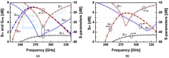 The simulated S-parameters of the three-stage amplifier with the designed input, interstage, and output impedance matching circuits on the schematic level are illustrated in Figure 10a. As observed, S11 and S22 were below −30 dB, and S21 was equal to Gma at 285 GHz. However, the simulation gain peaks at ~267 GHz which is similar to Gma. To flatten the gain at 285 GHz, the optimum impedance matching was performed at a higher frequency so that the peak gain could be tuned to 285 GHz. The simulated S-parameters of the three-stage cascaded amplifier are shown in Figure 10b. Around 0.47 dB of gain degradation was seen compared to the gain in the optimum impedance matching approach.
